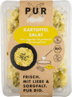 Zutaten46% Kartoffeln*, 16% Gewürzgurken* (Branntweinessig*, Rohrohrzucker*, Meersalz), 28% vegane Mayonnaise* (Sonnenblumenöl*, geschälte SOJABOHNEN*, Wasser, Reis*, Emulgator (Lecithine* (SOJA*))* Stabilisator (Guarkernmehl*), Meersalz, Zitronensaft*, Rohrohrzucker*, weißer Pfeffer*, SENF* (Wasser, GELBSENFSAAT*, Brantweinessig*, Meersalz, BRAUNSENFSAAT*, Gewürze*)) Schnittlauch*, Petersilie*, Gelbwurz* Legende *aus kontrolliert ökologischer Erzeugung |